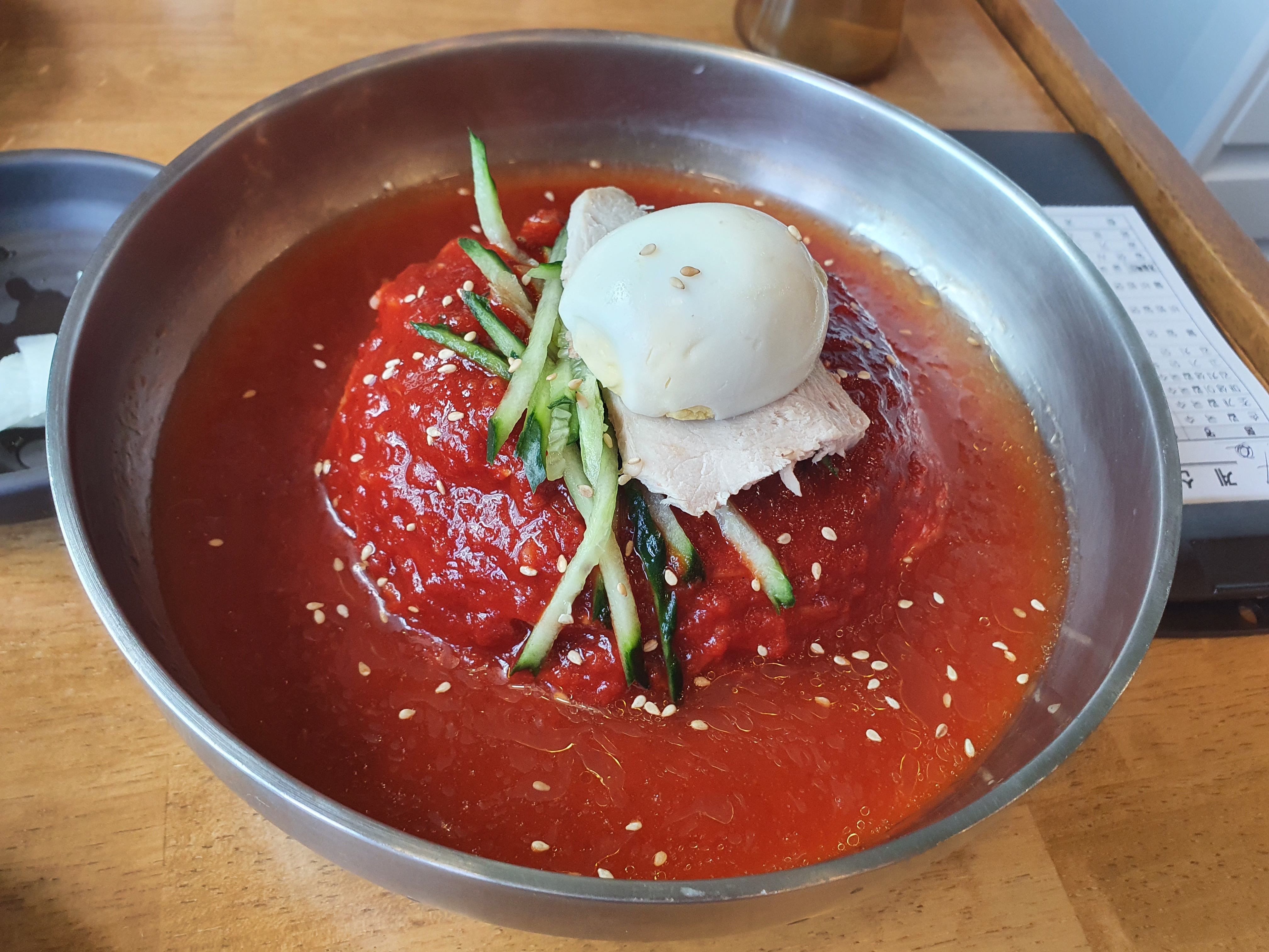 칼국수 종류도 다양해서 한번 칼국수도 먹어보고 싶었지만 아직 햇빛이 강해서 덥기도 하고 명절전 칼칼한 비빔밀면이 먹고 싶어서 물비빔밀면을 주문했어요.